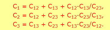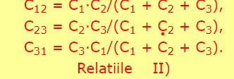 E12 Capacitatile intre bornele 1-2 din ambele montaje trebuie sa fie egale. La fel si intre bornele 2-3 respectiv 1-3. Rezulta relatiile: ![]() ![]() |